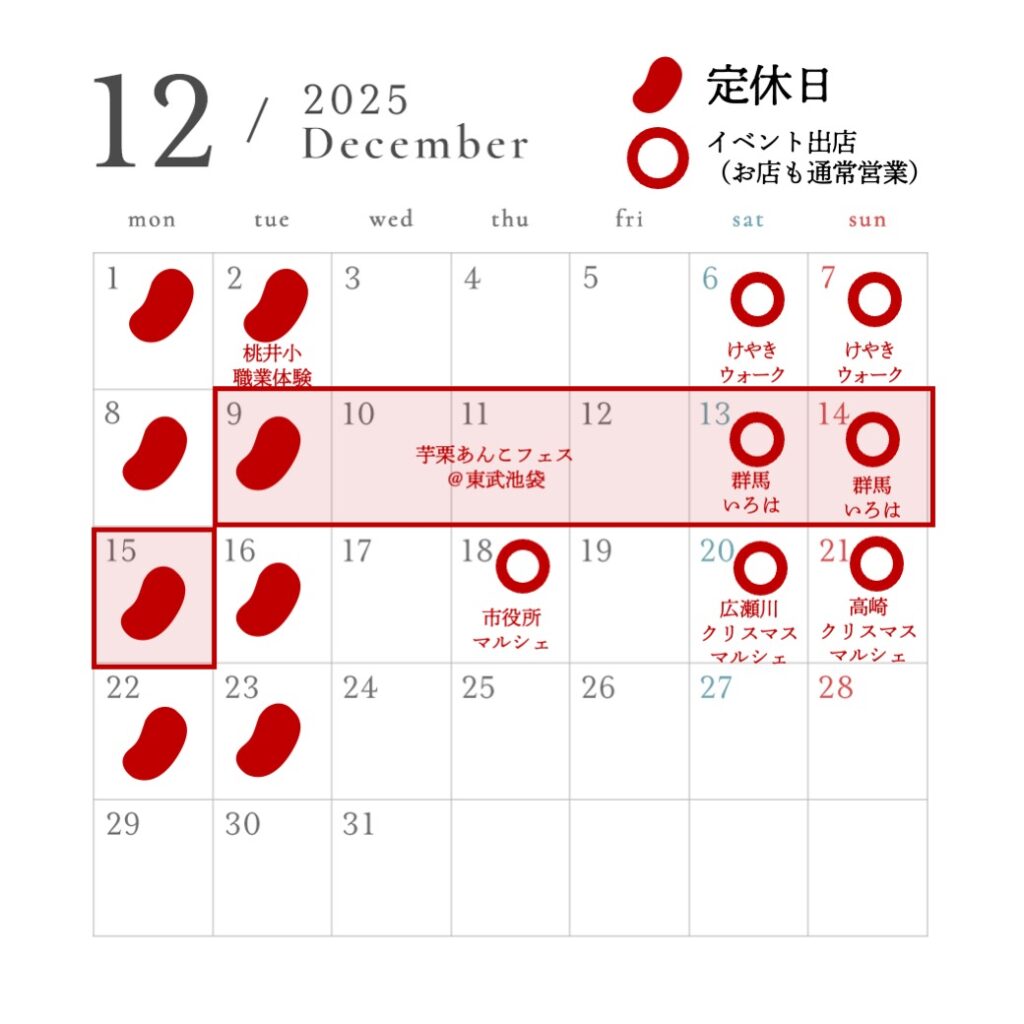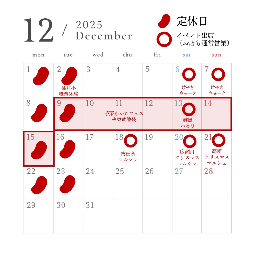今年も残すところあとわずかとなりました。街がイルミネーションで彩られ、クリスマスムードに包まれる12月。美味しいあんこのお菓子と共に、皆様の日常に小さな幸せをお届けできれば幸いです。寒さに負けず、皆様が健やかに、そして穏やかに年末を過ごされますよう心よりお祈り申し上げます。